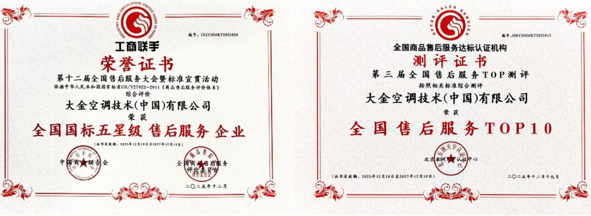 2025年,大金的服务体系实现了质的跨越。伴随“空气定制”战略的发布,依托DAIKIN CARE服务体系组建“空气定制师”专业团队,在咨询、安装、使用全流程中为用户提供专属服务,将服务从“被动响应”升级为“主动陪伴”。同年12月,这一服务体系获评“全国国标五星级售后服务企业”和“全国售后服务TOP10”两项权威荣誉。