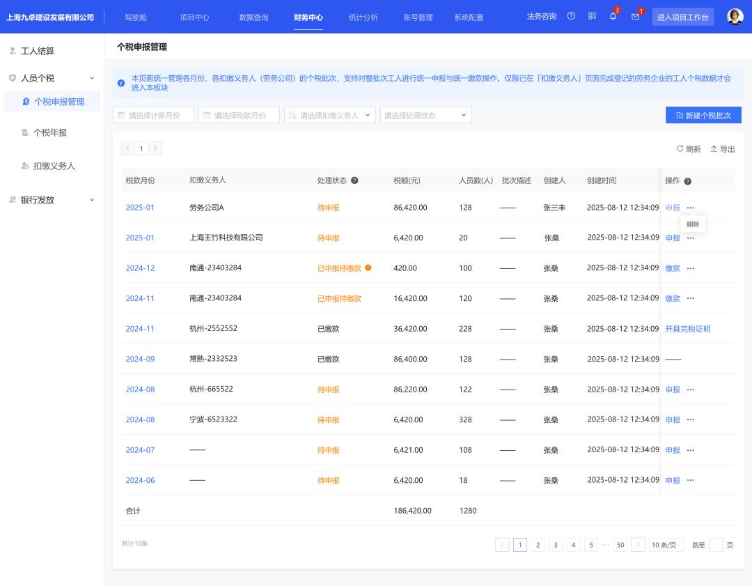 智能聚合,解决难题:行业多项目、多工人、流动性强的特点,在个税处理上尤为棘手。本功能支持多个项目与工人的合并计税与批量申报,有效地解决了这一难题。财务人员无需再在不同项目、不同人员的零散数据间手动切换与核对,系统自动完成聚合与计算,将企业从繁琐的机械劳动中解放。