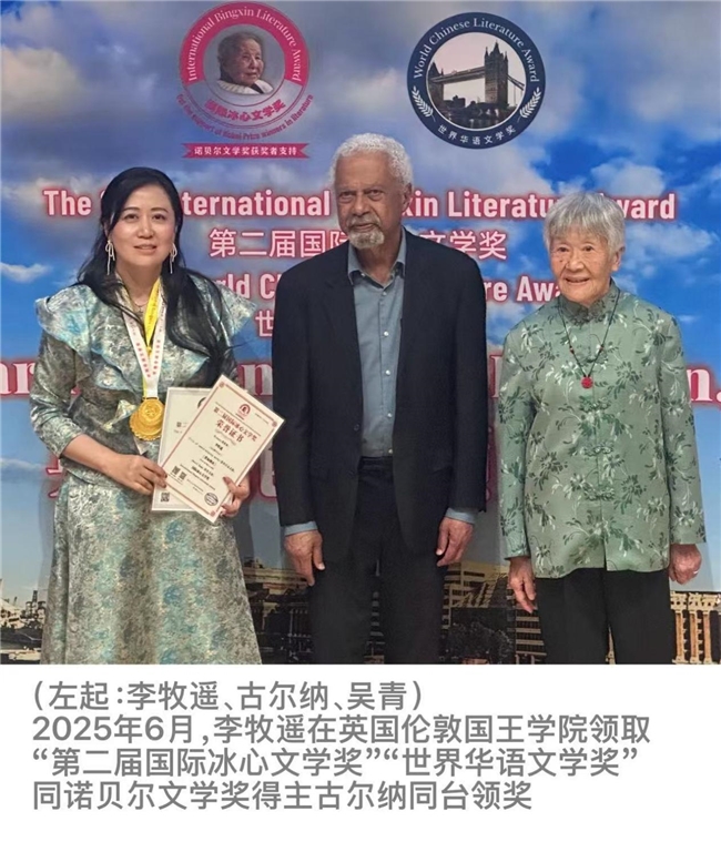 李牧遥非常感谢组委会对她文学的深切认可与高度褒奖;更由衷感念索因卡先生这位世界文坛巨匠真诚肯定与温暖鼓励。她认为这份殊荣不仅属于她个人,更是对中文写作持续深耕与多元对话的一份有力见证。她非常感恩两位诺贝尔文学奖获得者对中文写作的肯定。