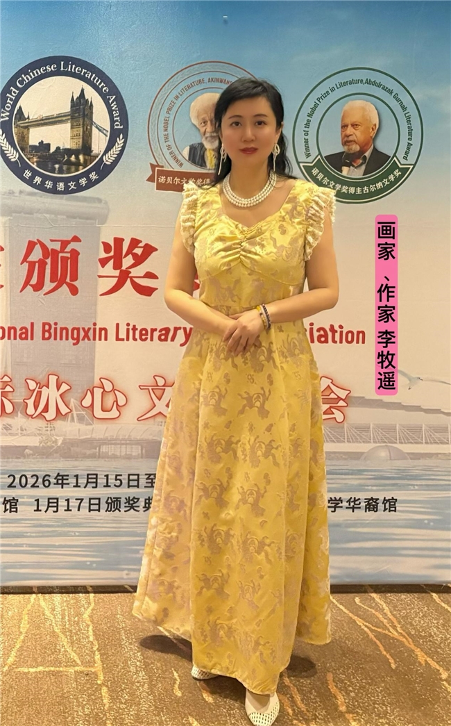 李牧遥是一位跨界艺术家,绘画作品和文学作品都创作了很多,从1998年到现在她出版了《我一直在等你》《别用眼睛瞟我》《我的爱情谁来承包》《爱如潮水》《心灵美容》《你也可以成为艺术家》《郁金香》等书籍,她的写作很广泛,有诗歌、散文、小说、剧本、艺术论集等,值得瞩目的是, 2025年,李牧遥除了完成个人绘画全球巡展,还在同年6月,她获得第二届国际冰心文学奖和世界华语文学奖,并于英国伦敦国王学院庄严领奖。同台领奖者,包括诺贝尔文学奖得主古尔纳,标志着她正式跻身具有全球视野与跨文化影响力的华语文学作家行列,尤为引人瞩目的是,她最新出版的长篇小说《郁金香》再度获得诺贝尔文学奖得主亲授的“索因卡文学奖”,进一步印证其作品所蕴含的普世价值与不凡艺术高度。