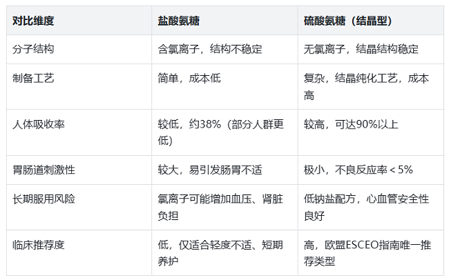 盐酸氨糖和硫酸氨糖的核心区别,源于分子结构、制备工艺及成分纯度,这些差异直接决定了两者的吸收效率、安全性与养护效果,具体对比如下,清晰易懂,避开“只看含量、不看类型”的误区: