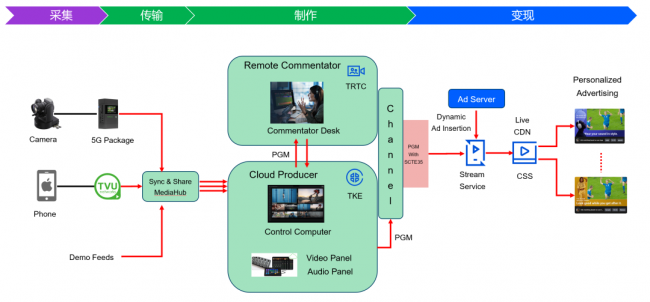 该场景重点展示了通过TVU MediaHub、TVU Producer、TVU Remote Commentator实现分组制作能力,支持远程解说,并基于腾讯IM消息平台实现解说员与粉丝的深度互动。