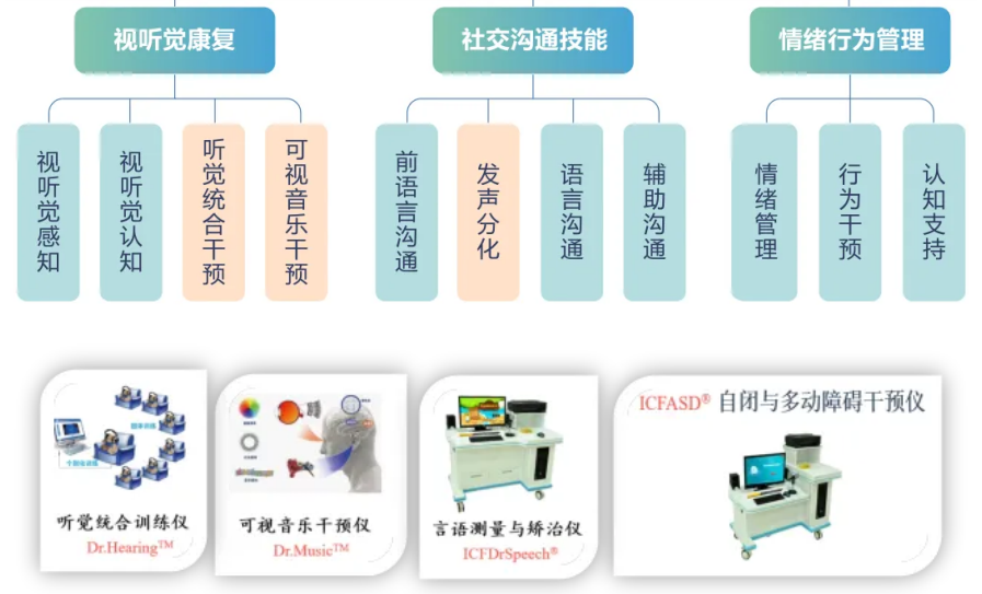 方案核心关键技术——“情绪发声沟通ICF-ESL疗法”,在视听觉统合康复基础上,聚焦社交沟通(Speech Vocalization 言语发声+ Functional Language功能性语言)与情绪行为(Emotion & Behavior)双轮驱动,构建阶梯式康复目标与程序,显著提升了孤独症儿童社交意向、功能语言及情绪调节能力。