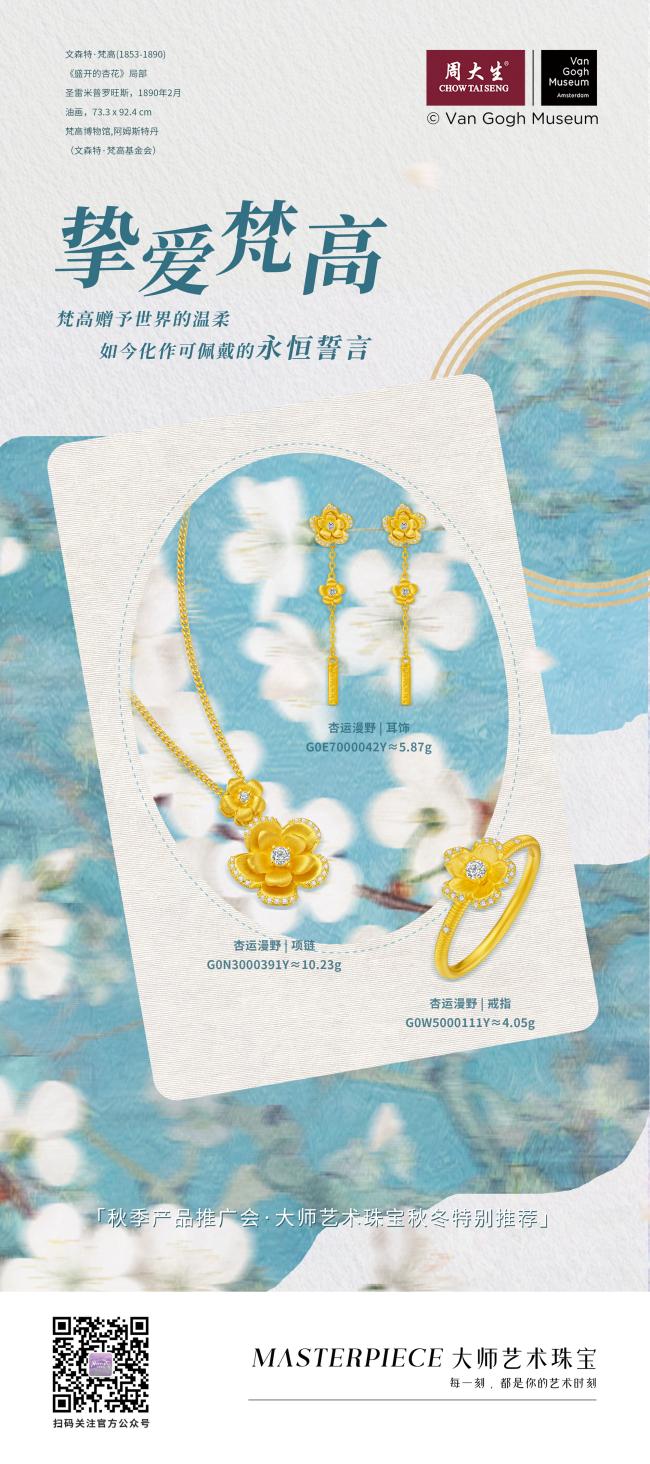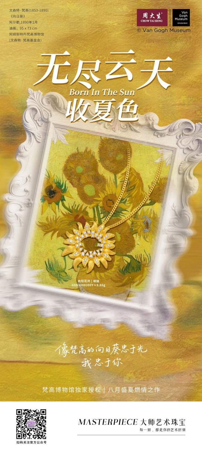 周大生大师艺术珠宝梵高Van Gogh系列,不只是对大师画作的简单复刻,更是对其艺术精神的传承与延续。从向日葵的炽热到杏花的清新,从立体雕刻的肌理,到渐变珐琅的光影,每一处细节无不体现对梵高艺术的致敬与对实用佩戴需求的考量。它打破了西方经典艺术与现代生活的壁垒,让梵高笔下的生命热忱与自然之美,化为可触摸、可佩戴的珠宝形态,让原本多用于鉴赏的经典艺术,走出展厅,成为融入日常穿搭的配饰,成为人人可感、可佩戴的生活诗篇。